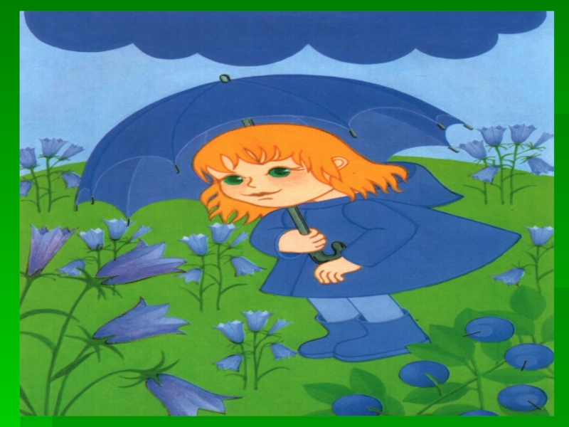 Девочка взяла мамин ФИОЛЕТОВЫЙ зонтик, надела ФИОЛЕТОВЫЙ плащ и вышла на улицу. И тут начался дождь.