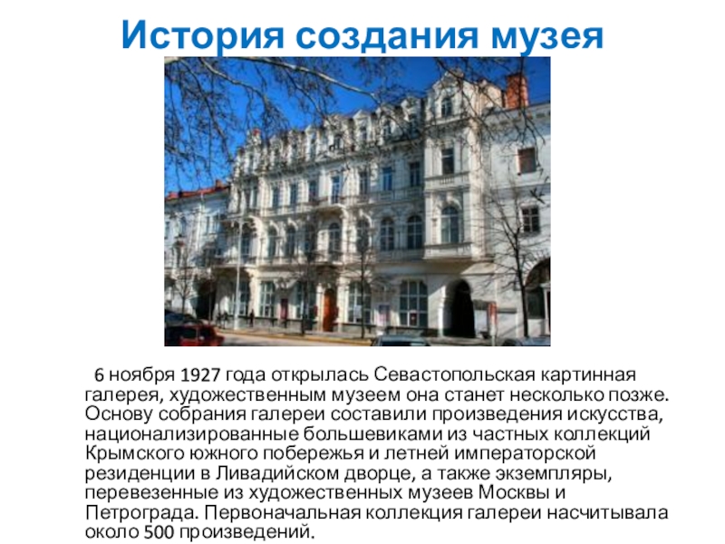 Севастопольская картинная галерея, художественным музеем она станет несколько позже. Основу собрания галереи составили произведения искусства, национализированные большевиками из частных коллекций Крымского южного побережья и летней императорской резиденции в Ливадийском дворце, а также экземпляры, перевезенные из художественных музеев Москвы и Петрограда. Первоначальная коллекция галереи насчитывала около 500 произведений.