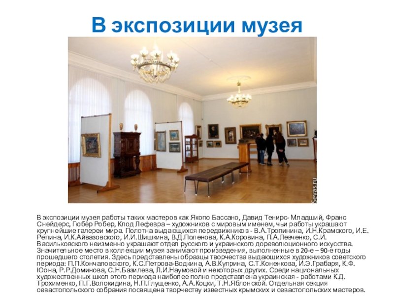 таких мастеров как Якопо Бассано, Давид Тенирс- Младший, Франс Снейдерс, Гюбер Робер, Клод Лефевра – художников с мировым именем, чьи работы украшают крупнейшие галереи мира. Полотна выдающихся передвижников - В.А.Тропинина, И.Н.Крамского, И.Е.Репина, И.К.Айвазовского, И.И.Шишкина, В.Д.Поленова, К.А.Коровина, П.А.Левченко, С.И.Васильковского неизменно украшают отдел русского и украинского дореволюционного искусства. Значительное место в коллекции музея занимают произведения, выполненные в 20-е – 90-е годы прошедшего столетия. Здесь представлены образцы творчества выдающихся художников советского периода: П.П.Кончаловского, К.С.Петрова-Водкина, А.В.Куприна, С.Т.Коненкова, И.Э.Грабаря, К.Ф.Юона, Р.Р.Доминова, С.Н.Базилева, Л.И.Наумовой и некоторых других. Среди национальных художественных школ этого периода наиболее полно представлена украинская - работами К.Д.Трохименко, П.Г.Волокидина, Н.П.Глущенко, А.А.Коцки, Т.Н.Яблонской. Отдельная секция севастопольского собрания посвящена творчеству известных крымских и севастопольских мастеров.