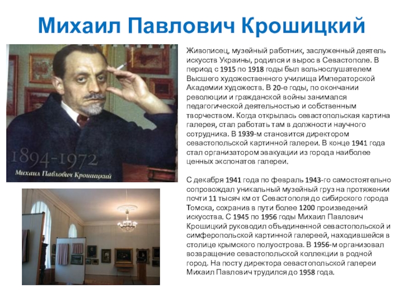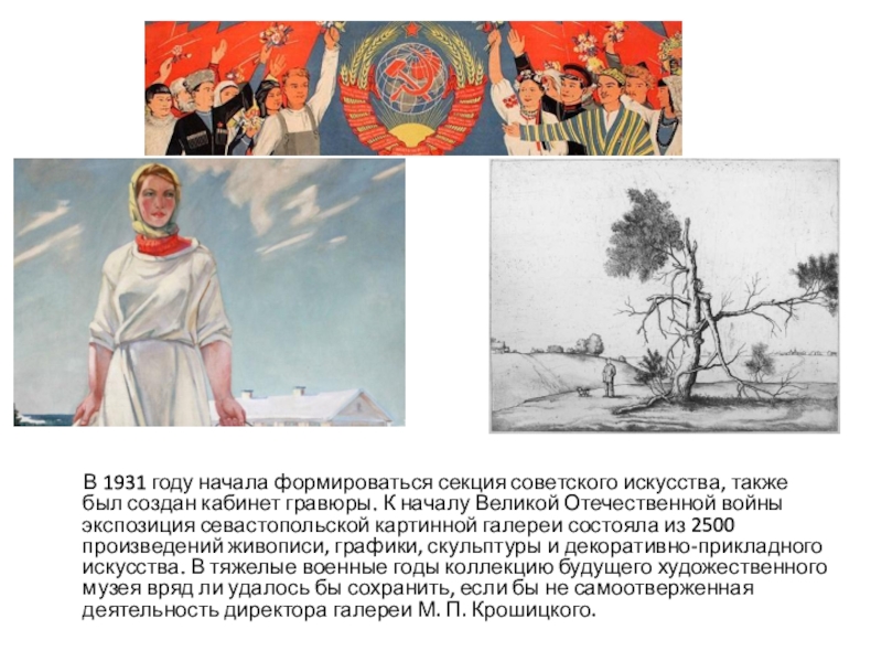 искусства, также был создан кабинет гравюры. К началу Великой Отечественной войны экспозиция севастопольской картинной галереи состояла из 2500 произведений живописи, графики, скульптуры и декоративно-прикладного искусства. В тяжелые военные годы коллекцию будущего художественного музея вряд ли удалось бы сохранить, если бы не самоотверженная деятельность директора галереи М. П. Крошицкого.