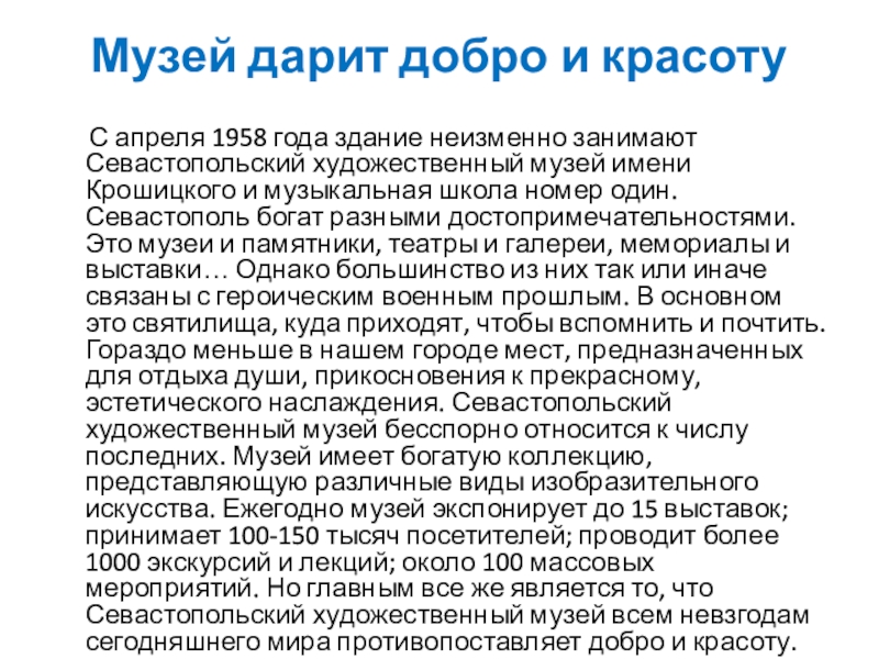 здание неизменно занимают Севастопольский художественный музей имени Крошицкого и музыкальная школа номер один. Севастополь богат разными достопримечательностями. Это музеи и памятники, театры и галереи, мемориалы и выставки… Однако большинство из них так или иначе связаны с героическим военным прошлым. В основном это святилища, куда приходят, чтобы вспомнить и почтить. Гораздо меньше в нашем городе мест, предназначенных для отдыха души, прикосновения к прекрасному, эстетического наслаждения. Севастопольский художественный музей бесспорно относится к числу последних. Музей имеет богатую коллекцию, представляющую различные виды изобразительного искусства. Ежегодно музей экспонирует до 15 выставок; принимает 100-150 тысяч посетителей; проводит более 1000 экскурсий и лекций; около 100 массовых мероприятий. Но главным все же является то, что Севастопольский художественный музей всем невзгодам сегодняшнего мира противопоставляет добро и красоту.