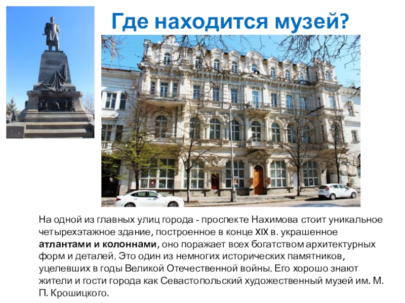 главных улиц города - проспекте Нахимова стоит уникальное четырехэтажное здание, построенное в конце XIX в. украшенное атлантами и колоннами, оно поражает всех богатством архитектурных форм и деталей. Это один из немногих исторических памятников, уцелевших в годы Великой Отечественной войны. Его хорошо знают жители и гости города как Севастопольский художественный музей им. М.П. Крошицкого.