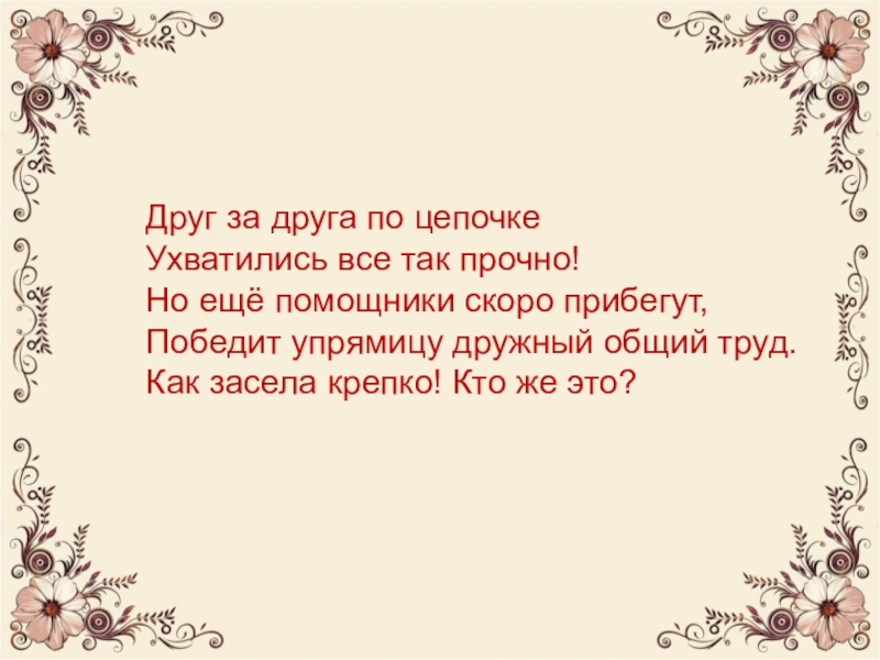 Слайд 6Друг за друга по цепочке Ухватились все так прочно! Но ещё помощники скоро