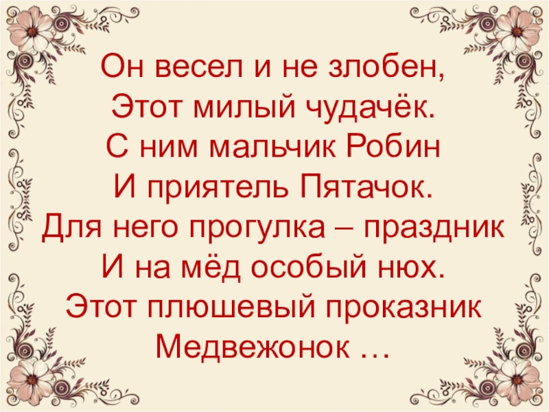 Он весел и не злобен, Этот милый чудачёк. С ним мальчик Робин И приятель Пятачок. Для него