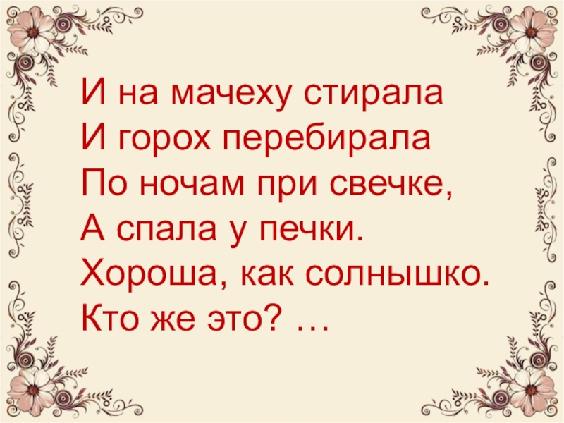 Слайд 14И на мачеху стирала И горох перебирала По ночам при свечке, А спала у