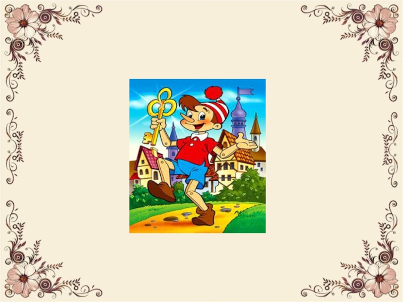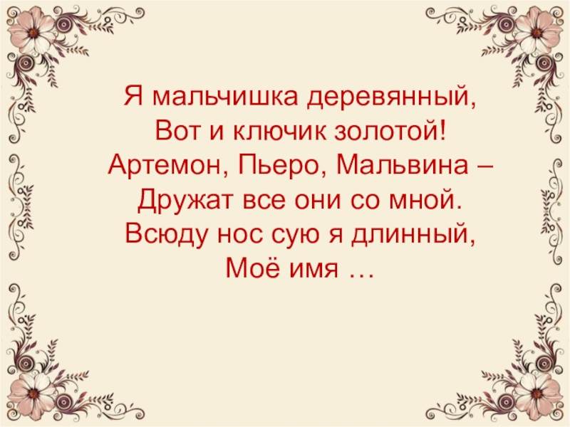 Я мальчишка деревянный, Вот и ключик золотой! Артемон, Пьеро, Мальвина – Дружат все они со мной. Всюду