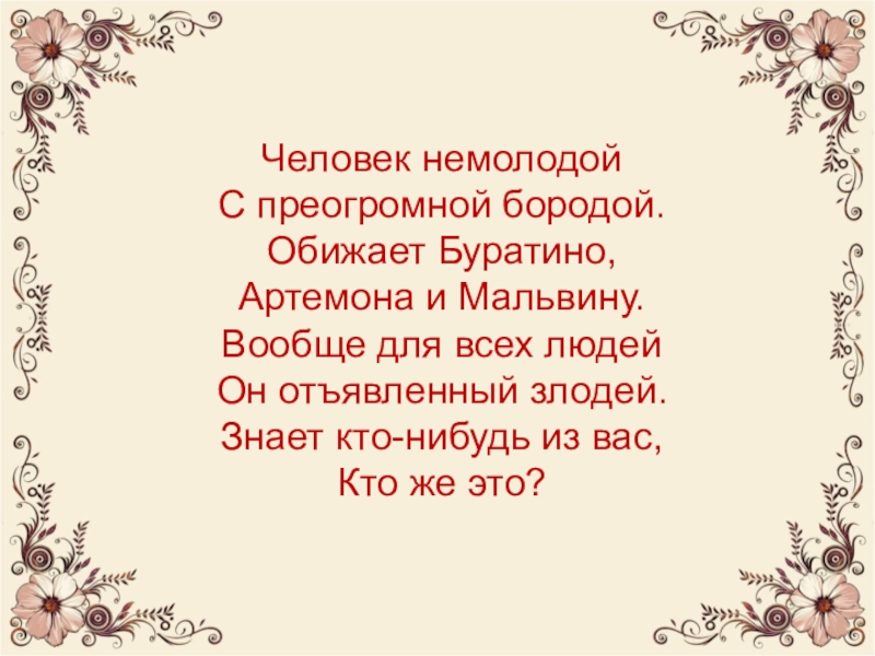 Человек немолодой С преогромной бородой. Обижает Буратино, Артемона и Мальвину. Вообще для всех людей Он отъявленный злодей.