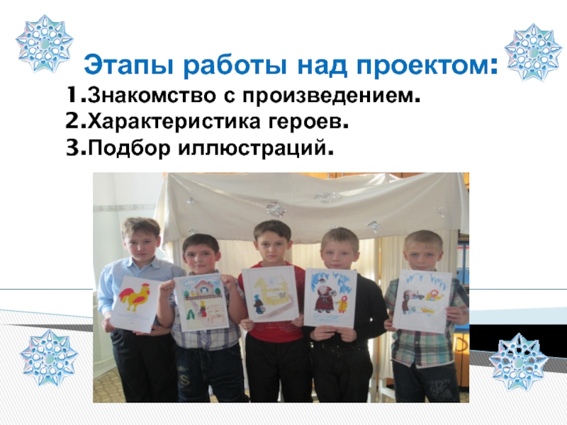 Этапы работы над проектом:1.Знакомство с произведением.2.Характеристика героев.3.Подбор иллюстраций.