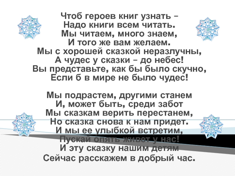 много знаем, И того же вам желаем. Мы с хорошей сказкой неразлучны, А чудес у сказки – до небес! Вы представьте, как бы было скучно, Если б в мире не было чудес! Мы подрастем, другими станем И, может быть, среди забот Мы сказкам верить перестанем, Но сказка снова к нам придет. И мы ее улыбкой встретим, Пускай опять живет у нас! И эту сказку нашим детям