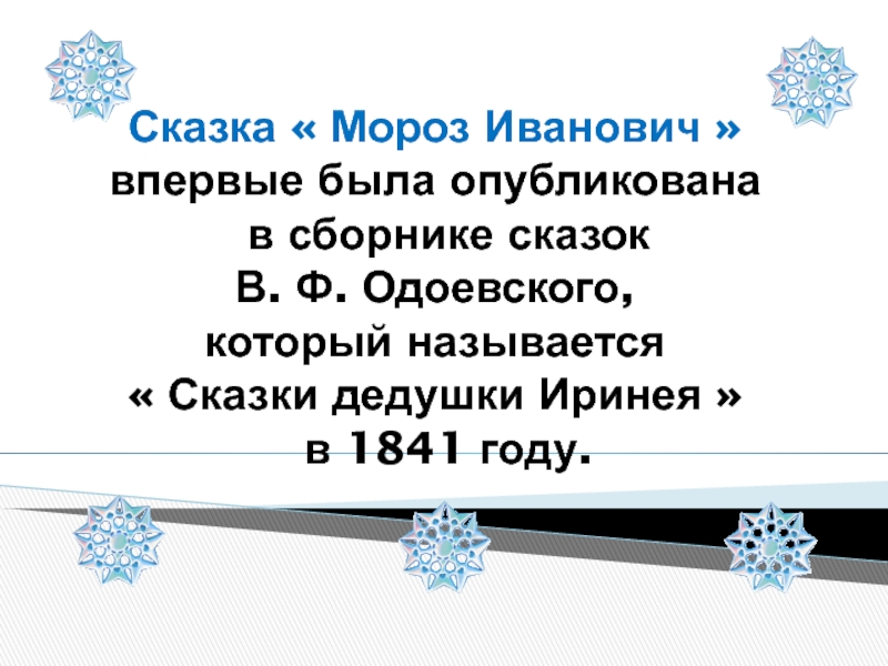 .Сказка « Мороз Иванович » впервые была опубликована  в сборнике сказокВ. Ф. Одоевского, который называется« Сказки