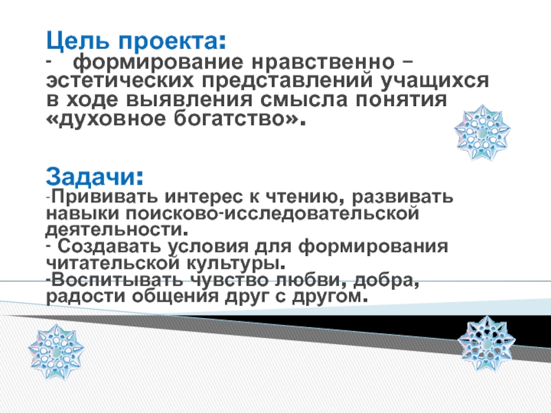 Цель проекта: -  формирование нравственно – эстетических представлений учащихся в ходе выявления смысла понятия «духовное богатство».
