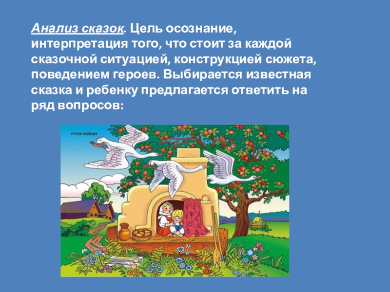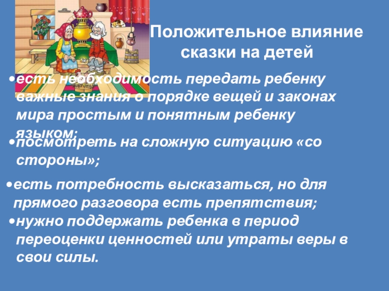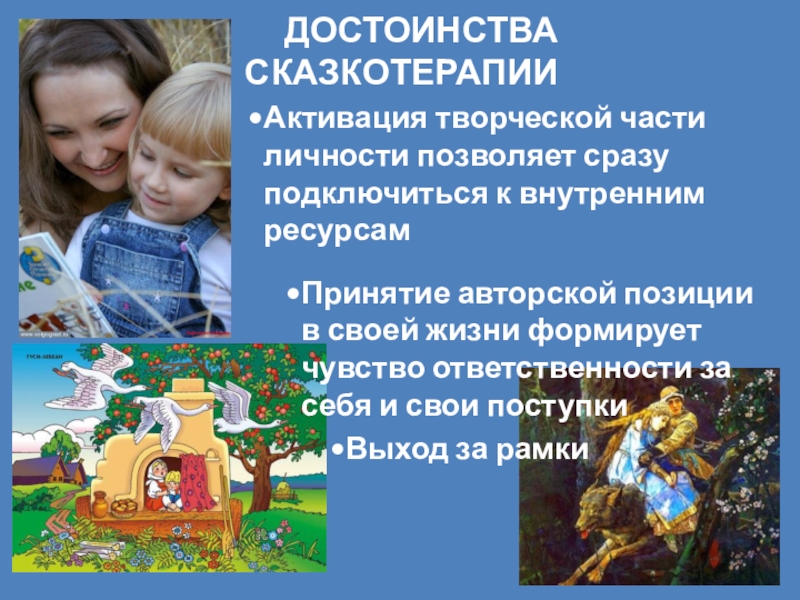 Сказкотерапия – метод, представляющий собой процесс образования связи между сказочными событиями и поведением в реальной жизни, путём переноса сказочных смыслов в реальность.