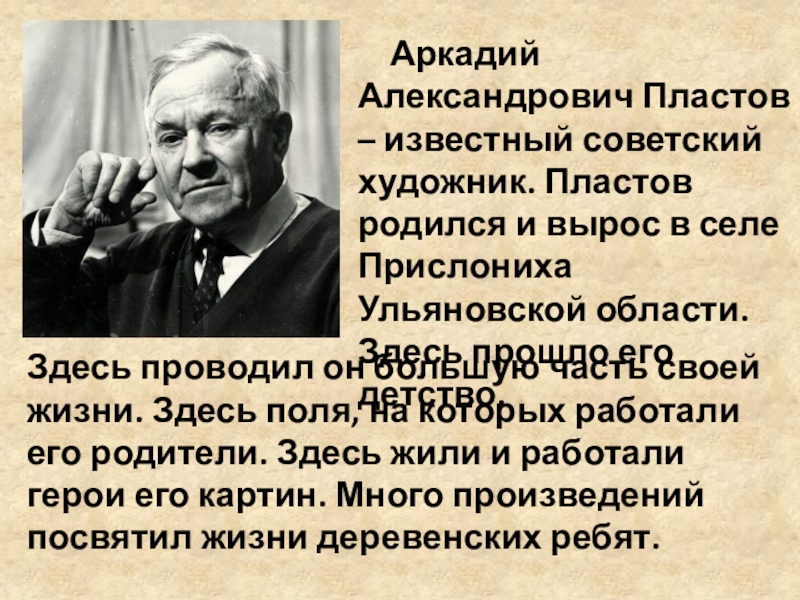 Здесь проводил он большую часть своей жизни. Здесь поля, на которых работали его родители. Здесь жили и работали герои его картин. Много произведений посвятил жизни деревенских ребят.