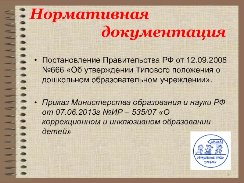 Приказ Министерства образования и науки РФ от 07.06.2013г №ИР – 535/07 «О коррекционном и инклюзивном образовании детей»