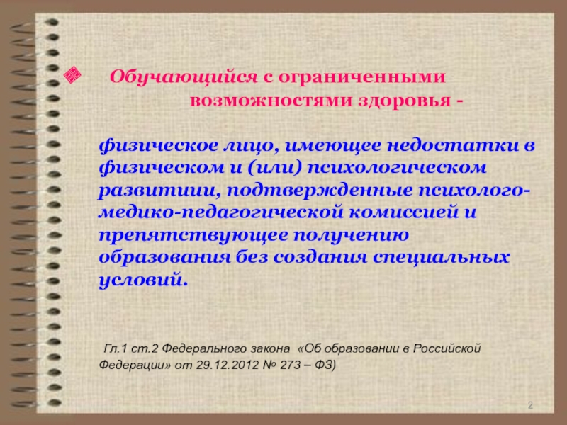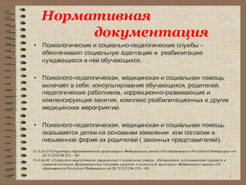 Гл.4 ст.42 «Психолого-педагогическая, медицинская и социальная помощь обучающимся, испытывающим трудности в освоении основных образовательных программ, развития и социальной адаптации» Федерального закона «Об образовании в Российской Федерации» от 29.12.2012 № 273 – ФЗ