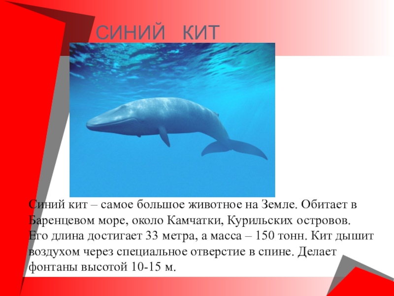 в Баренцевом море, около Камчатки, Курильских островов. Его длина достигает 33 метра, а масса – 150 тонн. Кит дышит воздухом через специальное отверстие в спине. Делает фонтаны высотой 10-15 м.