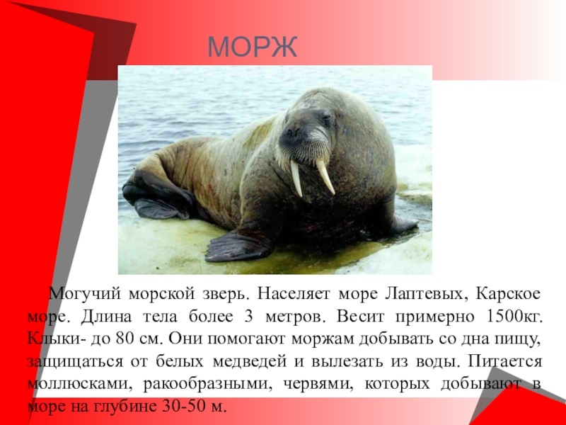 море Лаптевых, Карское море. Длина тела более 3 метров. Весит примерно 1500кг. Клыки- до 80 см. Они помогают моржам добывать со дна пищу, защищаться от белых медведей и вылезать из воды. Питается моллюсками, ракообразными, червями, которых добывают в море на глубине 30-50 м.