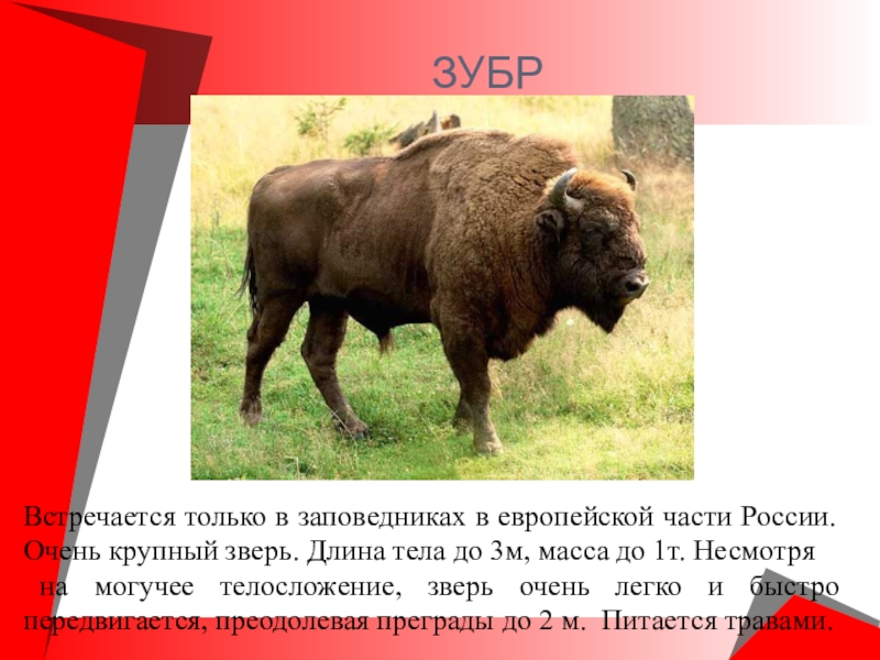 в заповедниках в европейской части России. Очень крупный зверь. Длина тела до 3м, масса до 1т. Несмотря
