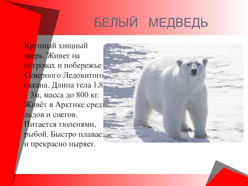 Крупный хищный зверь. Живет на островах и побережье Северного Ледовитого океана. Длина тела 1,8 – 3м, масса до 800 кг. Живёт в Арктике среди льдов и снегов. Питается тюленями, рыбой. Быстро плавает и прекрасно ныряет.