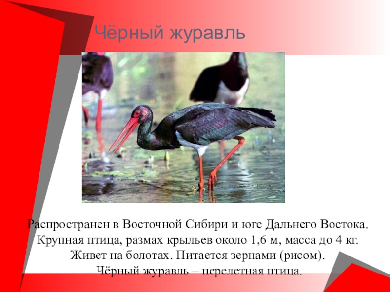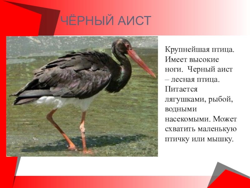 Крупнейшая птица. Имеет высокие ноги. Черный аист – лесная птица.