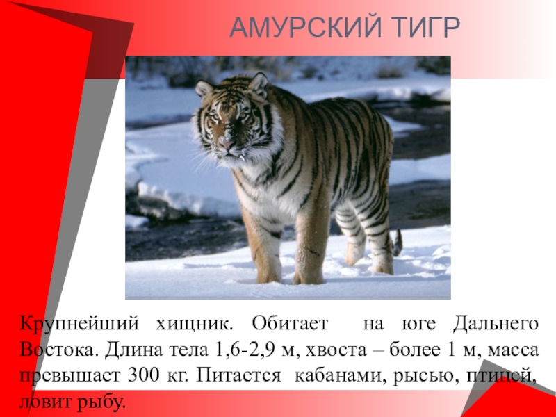 Обитает на юге Дальнего Востока. Длина тела 1,6-2,9 м, хвоста – более 1 м, масса превышает 300 кг. Питается кабанами, рысью, птицей, ловит рыбу.