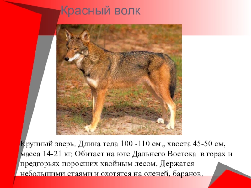 масса 14-21 кг. Обитает на юге Дальнего Востока в горах и предгорьях поросших хвойным лесом. Держатся небольшими стаями и охотятся на оленей, баранов.