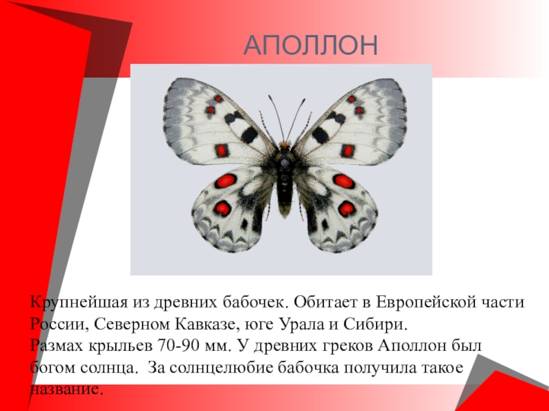 Размах крыльев 70-90 мм. У древних греков Аполлон был богом солнца. За солнцелюбие бабочка получила такое название.