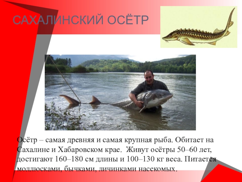 – самая древняя и самая крупная рыба. Обитает на Сахалине и Хабаровском крае. Живут осётры 50–60 лет, достигают 160–180 см длины и 100–130 кг веса. Питается моллюсками, бычками, личинками насекомых.