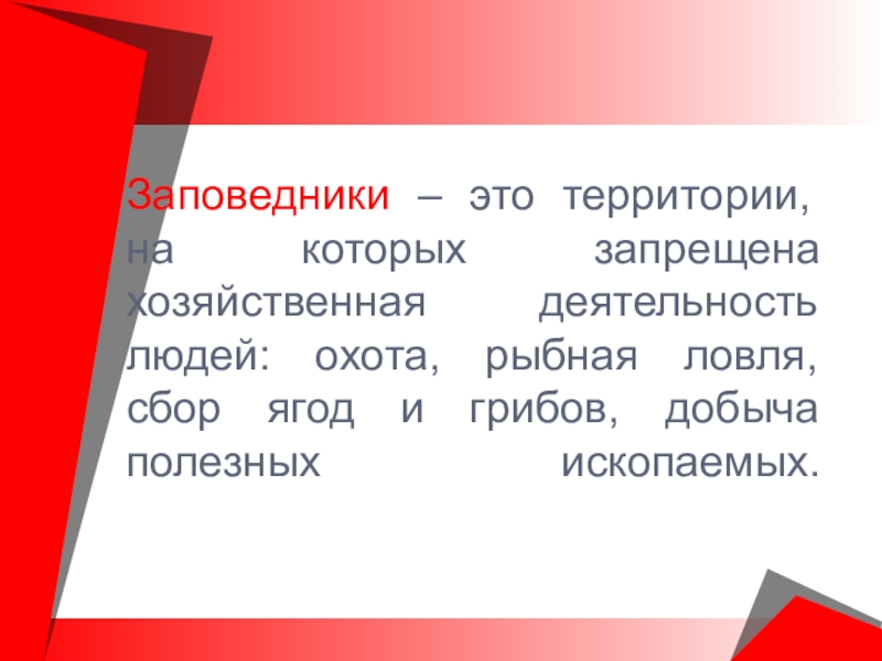 Слайд 19Заповедники – это территории, на которых запрещена хозяйственная деятельность людей: охота,