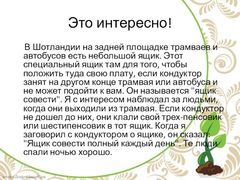 автобусов есть небольшой ящик. Этот специальный ящик там для того, чтобы положить туда свою плату, если кондуктор занят на другом конце трамвая или автобуса и не может подойти к вам. Он называется "ящик совести". Я с интересом наблюдал за людьми, когда они выходили из трамвая. Если кондуктор не дошел до них, они клали свой трех-пенсовик или шестипенсовик в тот ящик. Когда я заговорил с кондуктором о ящике, он сказал: "Ящик совести полный каждый день". Те люди спали ночью хорошо.