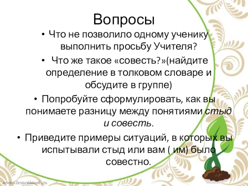 «совесть?»(найдите определение в толковом словаре и обсудите в группе)