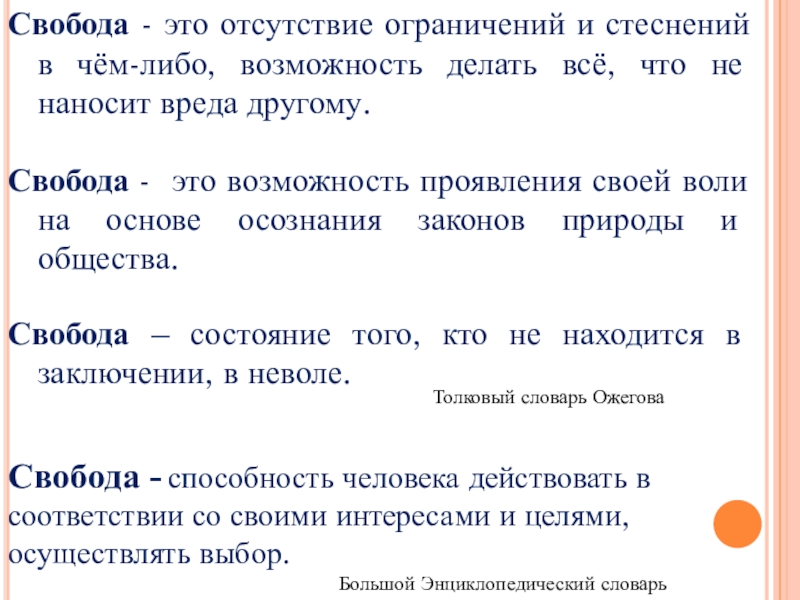 Свобода - способность человека действовать в соответствии со своими интересами и целями, осуществлять выбор.