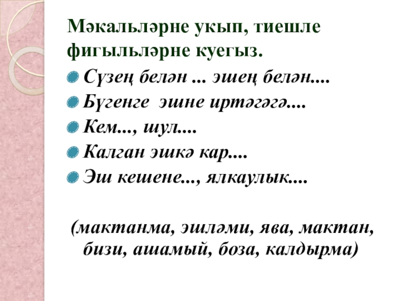 Слайд 11Мәкальләрне укып, тиешле фигыльләрне куегыз.