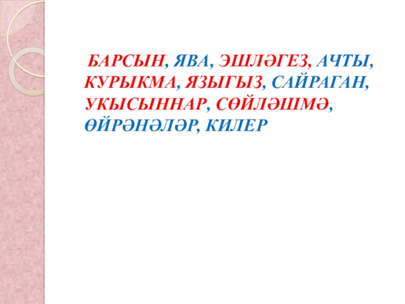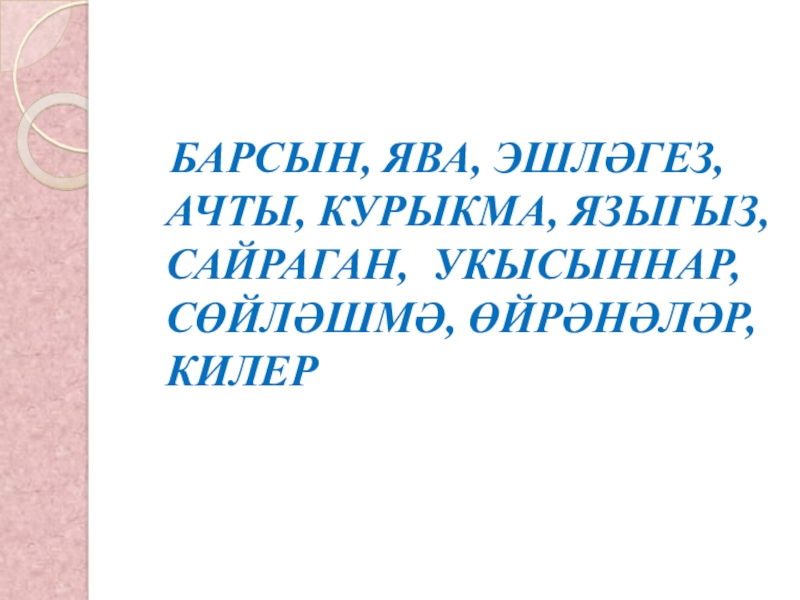 Слайд 4 БАРСЫН, ЯВА, ЭШЛӘГЕЗ, АЧТЫ, КУРЫКМА, ЯЗЫГЫЗ, САЙРАГАН, УКЫСЫННАР, СӨЙЛӘШМӘ, ӨЙРӘНӘЛӘР, КИЛЕР