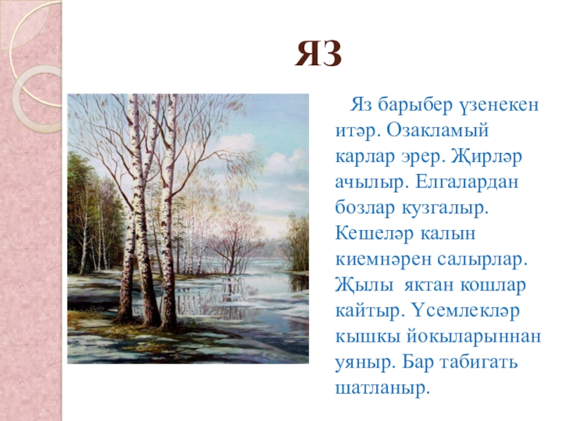 ачылыр. Елгалардан бозлар кузгалыр. Кешеләр калын киемнәрен салырлар. Җылы яктан кошлар кайтыр. Үсемлекләр кышкы йокыларыннан уяныр. Бар табигать шатланыр.