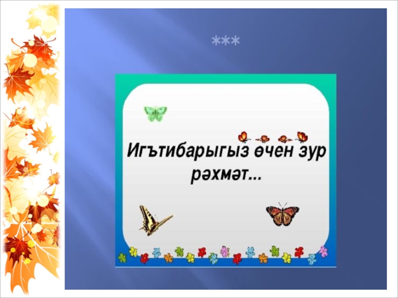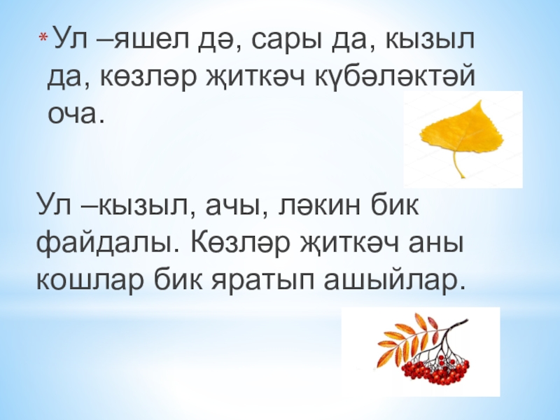 Слайд 5 Ул –яшел дә, сары да, кызыл да, көзләр җиткәч күбәләктәй