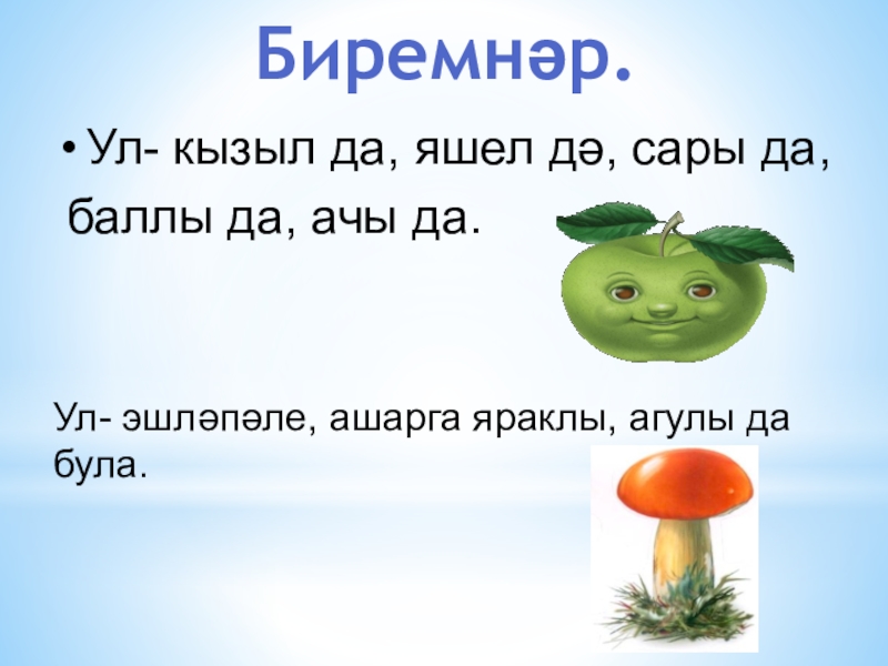 Биремнәр. Ул- кызыл да, яшел дә, сары да, баллы да, ачы да.Ул- эшләпәле, ашарга яраклы, агулы да