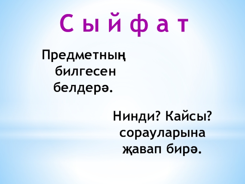 С ы й ф а тПредметның билгесен белдерә.Нинди? Кайсы?сорауларына җавап бирә.