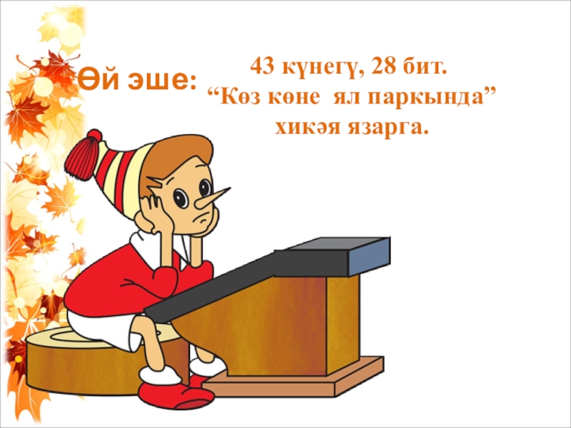 Слайд 943 күнегү, 28 бит. “Көз көне ял паркында” хикәя язарга.