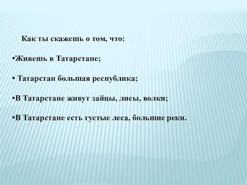 Как ты скажешь о том, что:Живешь в Татарстане; Татарстан большая республика;В Татарстане живут зайцы, лисы,