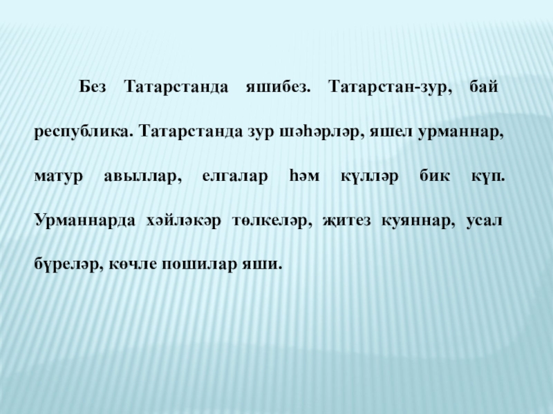 Без Татарстанда яшибез. Татарстан-зур, бай республика. Татарстанда зур шәһәрләр, яшел урманнар, матур авыллар, елгалар һәм