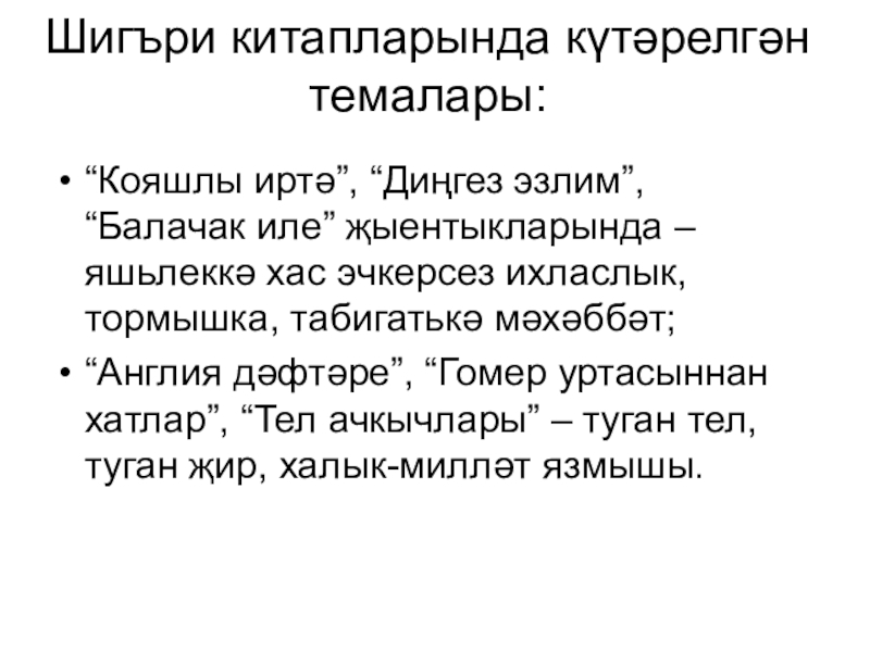 Слайд 8Шигъри китапларында күтәрелгән темалары:
