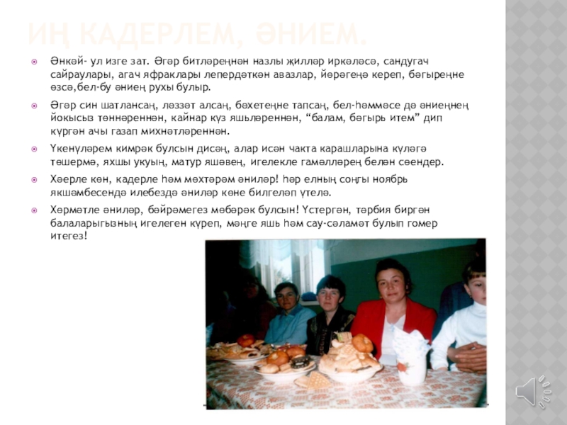 Дөньяда сабый бала “әннә” дип беренче тапкыр аваз сала Аннары гомер буе кеше әнкәйләрнең ягымлы карашларын, яратуын тоеп яши. Аларның хәер -фатихасы, акыллы киңәшләре тормышта ныклы терәк булып тора.Ә без “Балам!” дип өзгәләнеп, хәттә җанын бирергә риза булган әниләрне онытмыйбызмы? Алтыннарга күмәргә уйлап хыялланырга яисә шуны эшли алмаганга үкенергә дә кирәкмидер. Чөнки ал арга бит чын күңелдән яратып әйтелгән гап-гади сүзләр дә җитә. Бәлки әниләргә әнә шул рәвешле хөрмәт күрсәтеп, аз гына булса да без китергән мәшәкатьләрне оныттырырбыз.