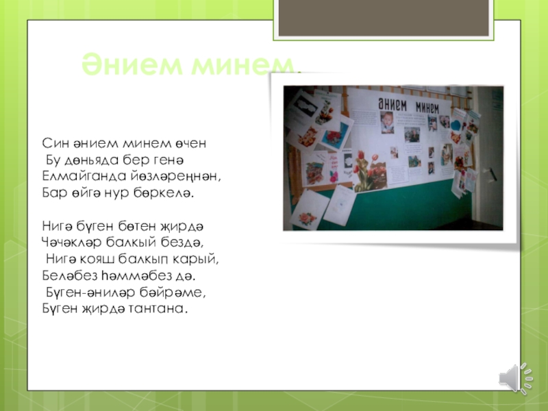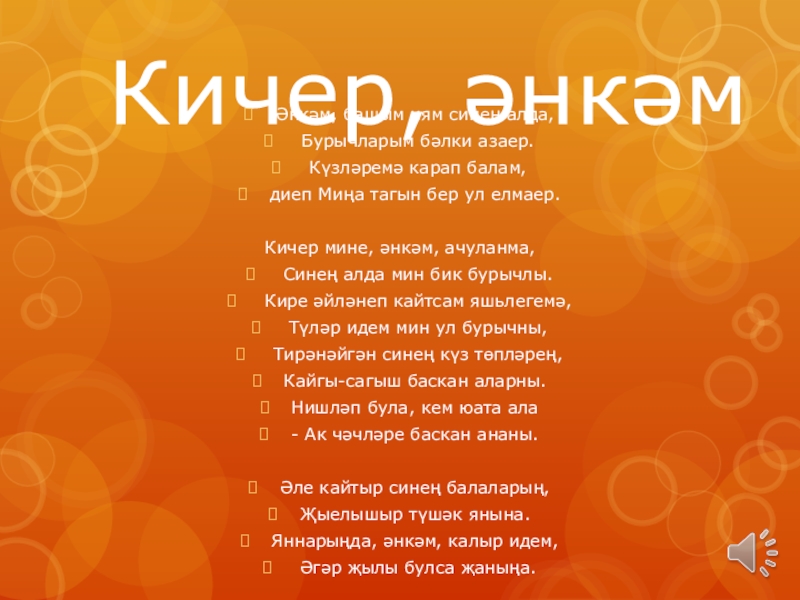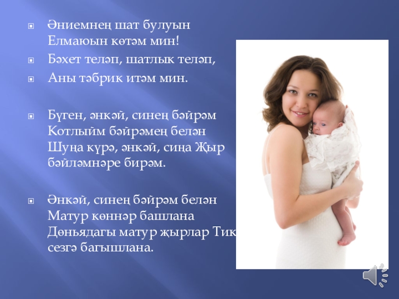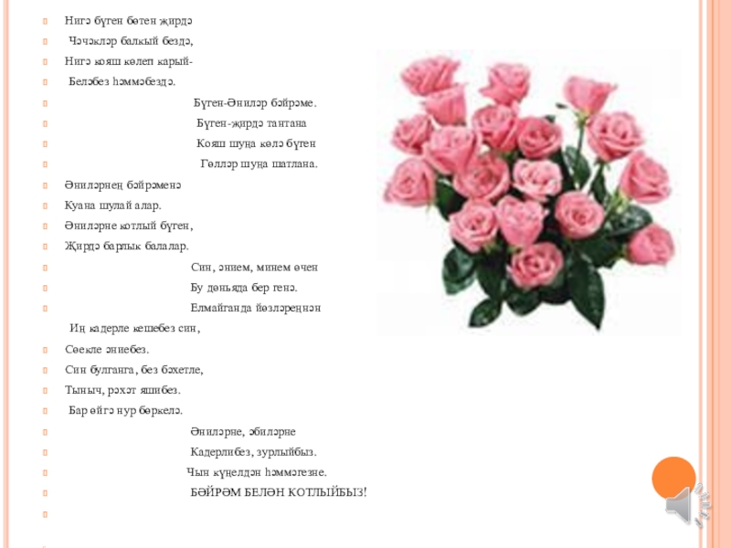 Әнкәй, синең бәйрәм белән Матур көннәр башлана Дөньядагы матур җырлар Тик сезгә багышлана.