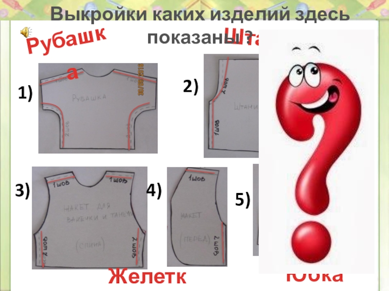 (деталь будущего изделия, выполненная из бумаги, кальки, ткани или других материалов).