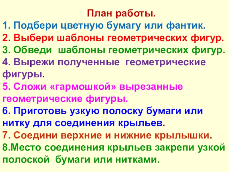 План работы. 1. Подбери цветную бумагу или фантик. 2. Выбери шаблоны геометрических фигур. 3. Обведи шаблоны геометрических фигур. 4. Вырежи полученные геометрические фигуры. 5. Сложи «гармошкой» вырезанные геометрические фигуры. 6. Приготовь узкую полоску бумаги или нитку для соединения крыльев. 7. Соедини верхние и нижние крылышки. 8.Место соединения крыльев закрепи узкой полоской бумаги или нитками.