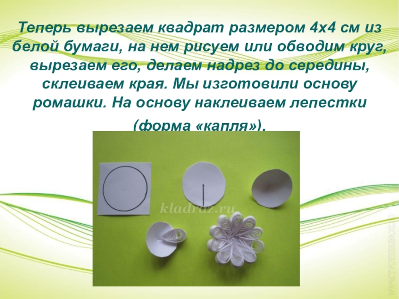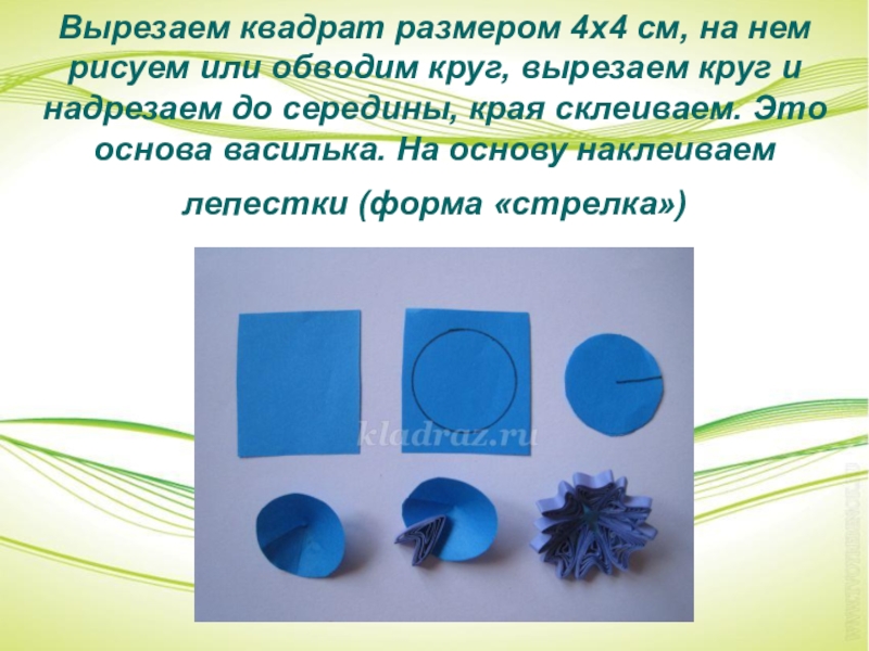Слайд 13Вырезаем квадрат размером 4х4 см, на нем рисуем или обводим круг,