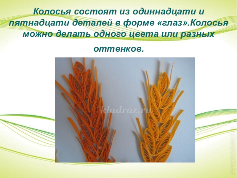 Слайд 20Колосья состоят из одиннадцати и пятнадцати деталей в форме «глаз».Колосья можно