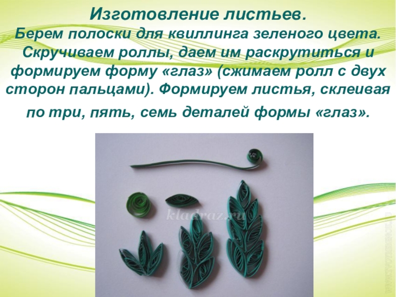 раскрутиться и формируем форму «глаз» (сжимаем ролл с двух сторон пальцами). Формируем листья, склеивая по три, пять, семь деталей формы «глаз».