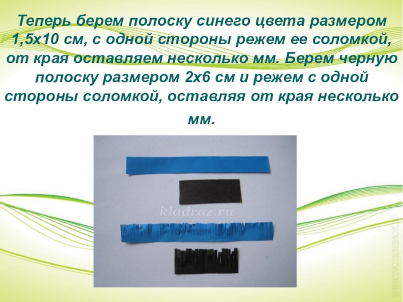 Слайд 14Теперь берем полоску синего цвета размером 1,5х10 см, с одной стороны